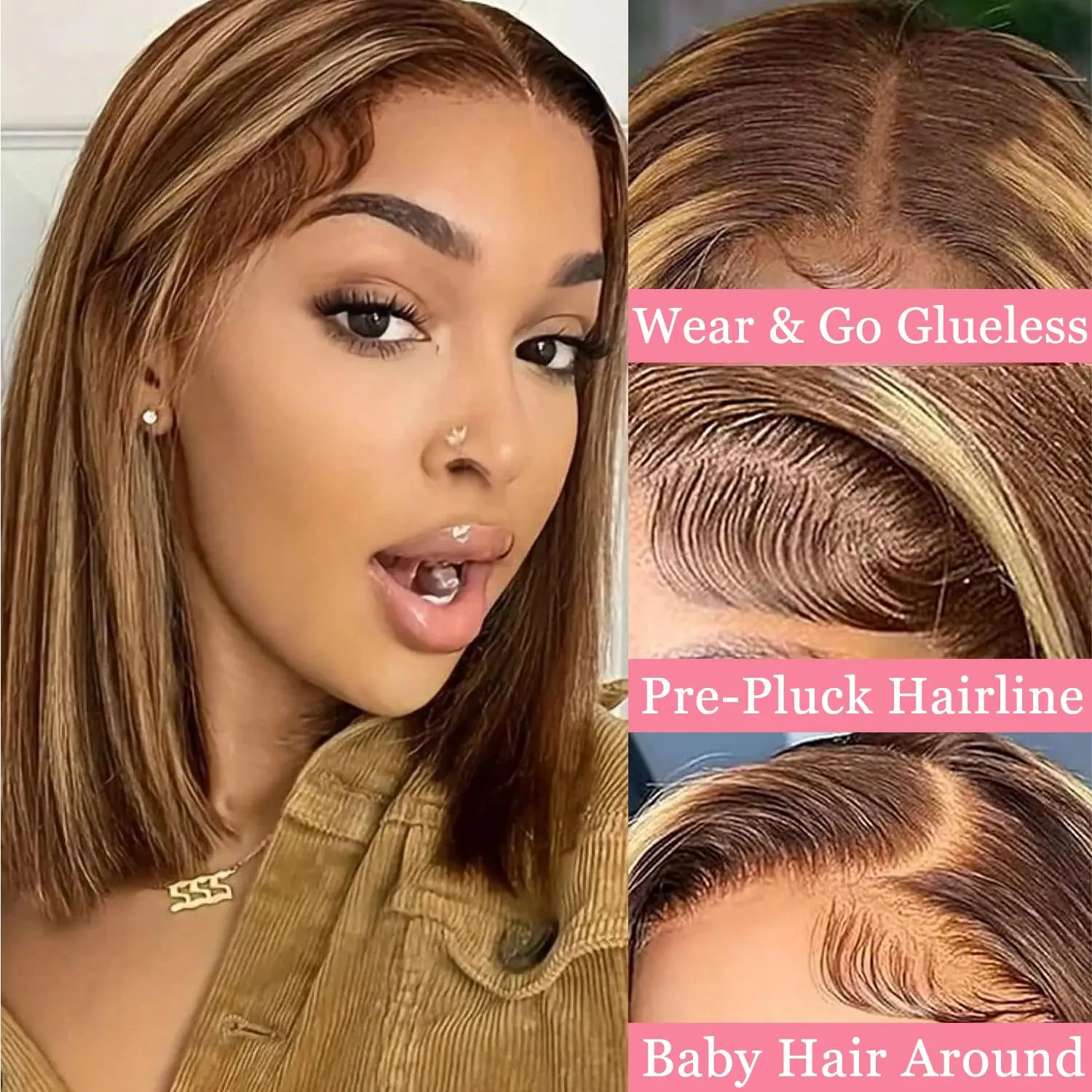 Bob Wig Human Hair Highlight Ombre 4x4 HD Lace Front Pre Plucked 180 Density Short Bob Wigs for Women Glueless