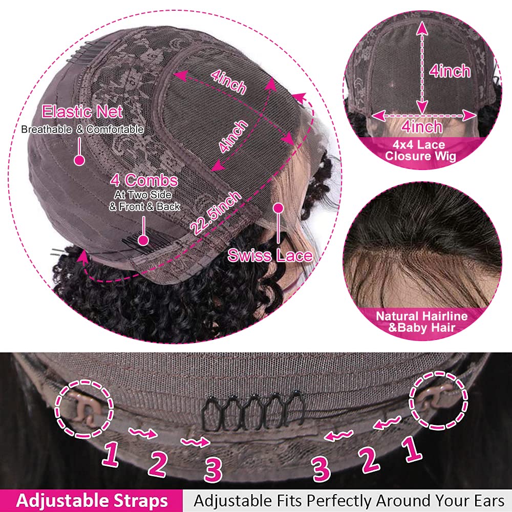 【Cap Size】Average Size Cap(22.5 circumferences inch ), Glueless Human Hair Wigs with Elastic Straps and 4 Combs,Easy to Adjust, Comfortable, Durable and Match Head Perfectly.